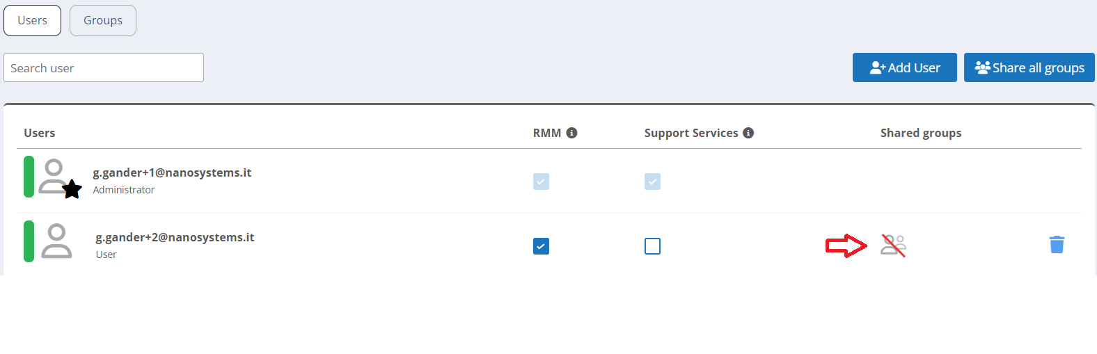 Después de compartir, el icono inicial se sustituye por el número de grupos compartidos con cada usuario/operador.