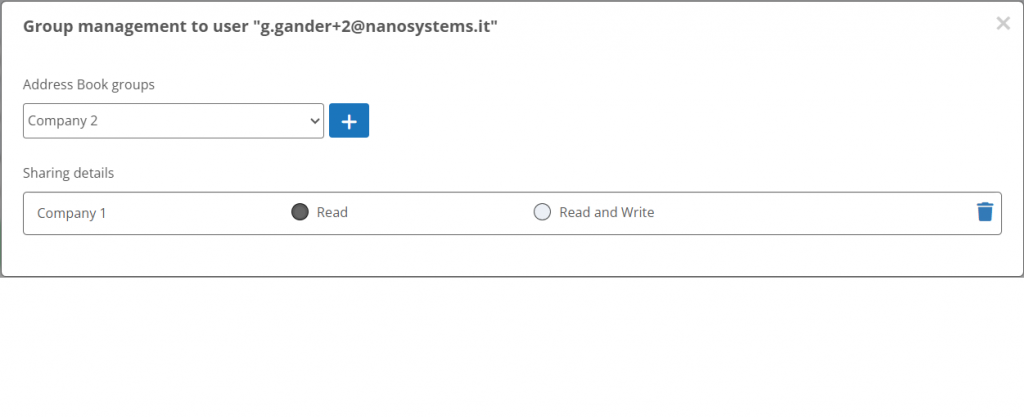 - directamente desde la Libreta de Direcciones, haciendo clic en el grupo individual y escribiendo el correo electrónico de la cuenta que se deseas compartir. Este modo se recomienda cuando se comparten grupos individuales con sólo unos pocos compañeros de trabajo