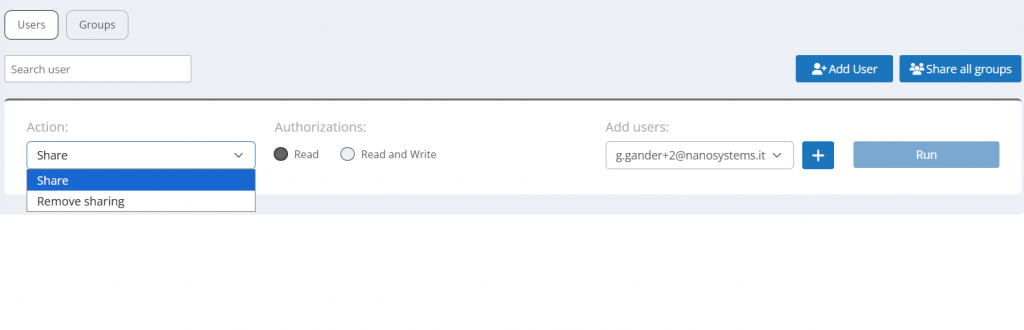 Puedes realizar la compartición directamente desde tu cliente Supremo seleccionando el grupo a compartir y haciendo clic en el botón Compartir (en la parte derecha de la pantalla, en la sección Control).