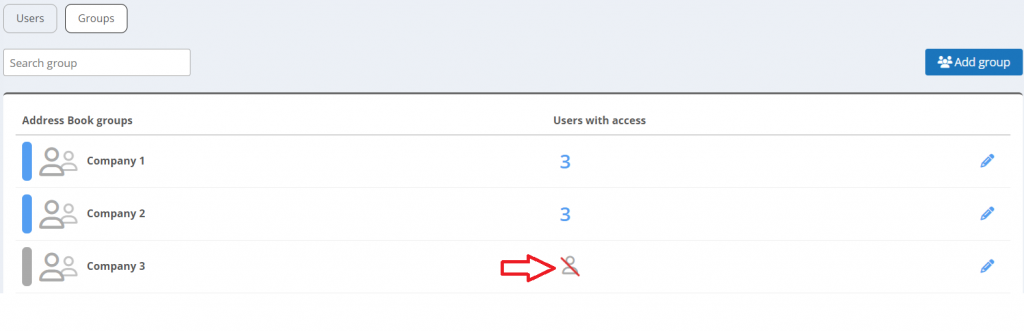 - utilizando las funciones para compartir grupos rápidos en Gestión Usuarios. Aquí puedes compartir rápidamente grupos de contactos de diferentes maneras con todos tus colaboradores, directamente desde la lista de usuarios, haciendo clic en el símbolo que se muestra en la imagen (para saber cómo añadir usuarios a la lista haz clic aquí)