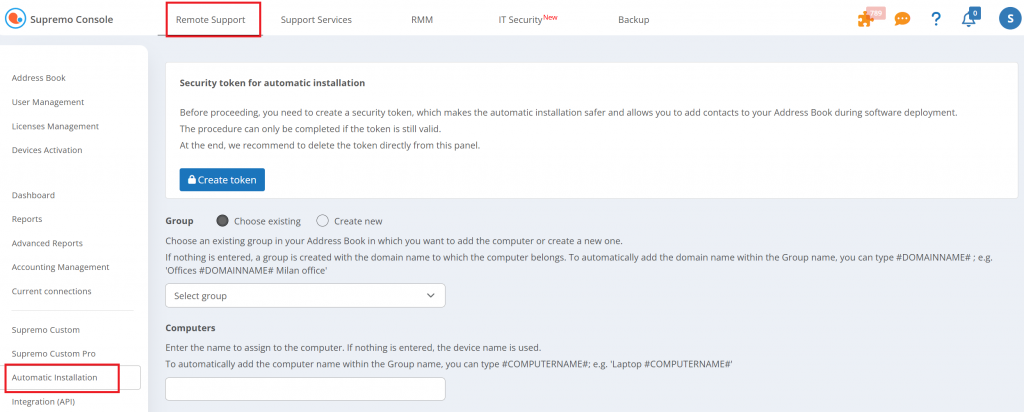 At the link Remote Support – Automatic Installation, you can generate the command line for the automatic installation of Supremo, using the file .exe, .msi or .msi with .mst.