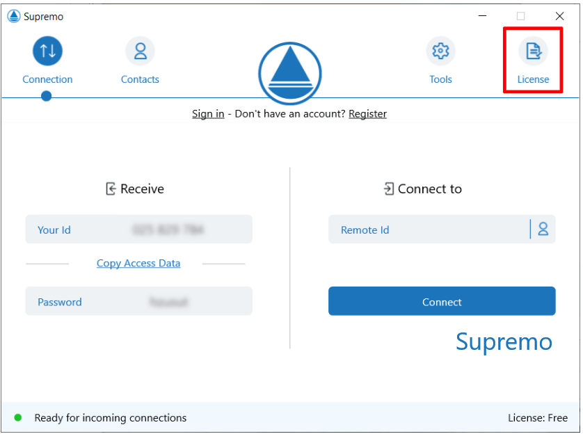 After downloading and starting the program, click on License at the top of the Supremo screen